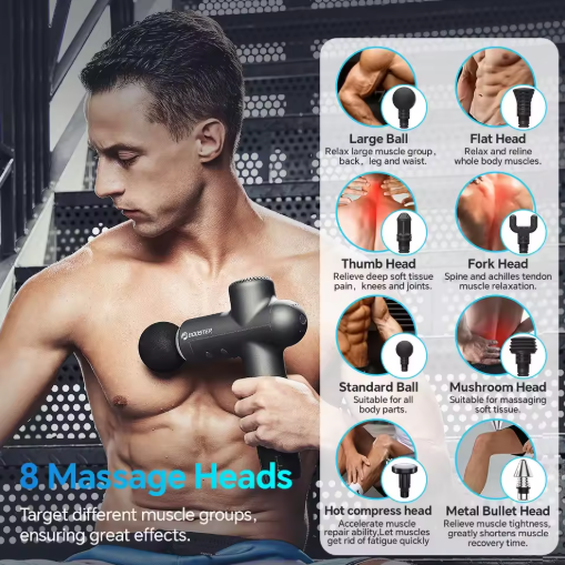 Electric Massage Gun rechargeable. Accelerate recovery with our deep tissue massage gun, featuring both hot and cold therapy modes. Designed to target sore muscles, stiffness, and fatigue, it delivers customizable percussion therapy while the temperature function enhances circulation and reduces inflammation. Perfect for total body pain relief at home.